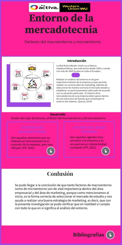 La Red Activa Wester Unión es un Banco estadounidense, que está activo desde 1994 y cuenta con más de 3500 locales en todo el Ecuador. Realizar un análisis del entorno es de gran importancia dentro de la empresa ya que permite realizar un correcto plan de marketing, además de seleccionar de manera correcta el mercado estudio y establecer un posicionamiento adecuado de acuerdo con su situación particular. El sistema de la mercadotecnia de una empresa debe operar dentro de una estructura de fuerzas que constituyan el entorno del sistema (Quiroa, 2019).