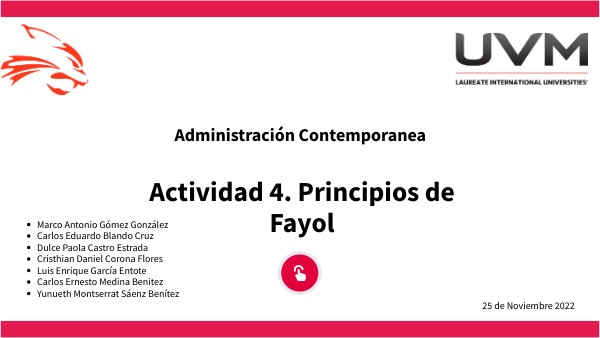 Referencias: • Economipedia. (2022). Los 14 principios de la administración de Henri Fayol. Recuperado el 24 de noviembre del 2022, de https://economipedia.com/definiciones/14-principios-de-administracion-henri-fayol.html • Spadaro, J. (2022, mayo 3). Los 14 Principios De Fayol Explicados Con Ejemplos. Conjunto de Ideas. Recuperado el 24 de noviembre del 2022, de https://www.ensambledeideas.com/14-principios-de-fayol/