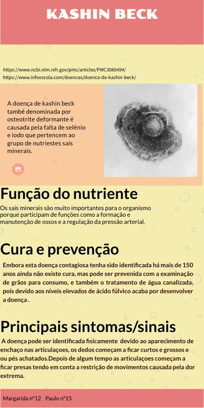 A doença de kashin beck també denominada por osteotrite deformante é causada pela falta de selénio e iodo que pertencem ao grupo de nutriestes sais minerais.