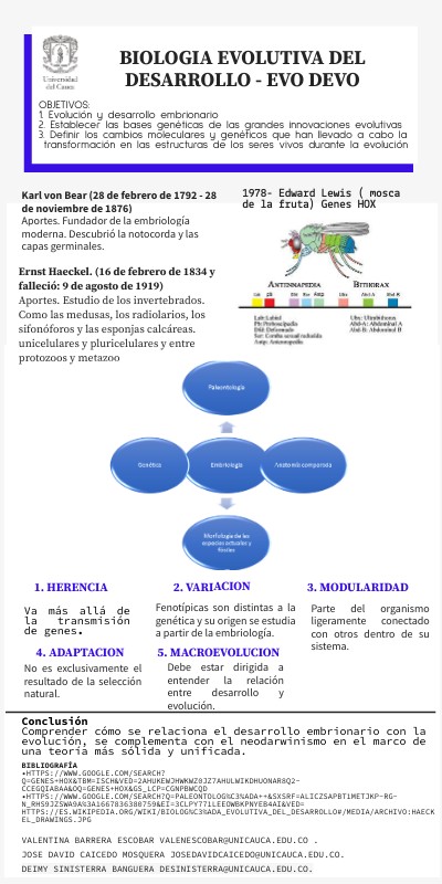 Bibliografía •https://www.google.com/search?q=genes+HOx&tbm=isch&ved=2ahUKEwjHwKWz0Jz7AhULwikDHUONAR8Q2-cCegQIABAA&oq=genes+HOx&gs_lcp=CgNpbWcQD •https://www.google.com/search?q=Paleontolog%C3%ADa++&sxsrf=ALiCzsaPbT1mETjKp-rg-N_rHs9jzswa9A%3A1667836380759&ei=3ClpY771LeeOwbkPnYeB4AI&ved= https://es.wikipedia.org/wiki/Biolog%C3%ADa_evolutiva_del_desarrollo#/media/Archivo:Haeckel_drawings.jpg