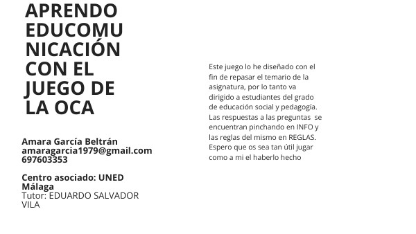 Este juego lo he diseñado con el fin de repasar el temario de la asignatura, por lo tanto va dirigido a estudiantes del grado de educación social y pedagogía. Las respuestas a las preguntas se encuentran pinchando en INFO y las reglas del mismo en REGLAS. Espero que os sea tan útil jugar como a mi el haberlo hecho
