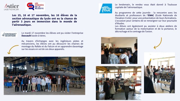 Les 15, 16 et 17 novembre, les 16 élèves de la section aéronautique du lycée ont eu la chance de partir 3 jours en immersion dans le monde de l'aéronautique.