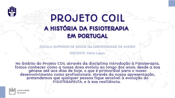 No âmbito do Projeto COIL através da disciplina Introdução à Fisioterapia, fomos conhecer como a nossa área evoluiu ao longo dos anos, desde a sua génese até aos dias de hoje, o que é primordial para o nosso desenvolvimento como profissionais. Através da nossa apresentação, pretendemos que qualquer pessoa fique sensível à evolução do FISIOTERAPEUTA, e à sua resiliência.