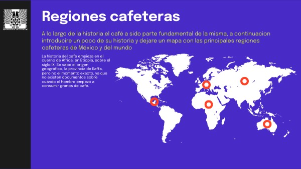 A lo largo de la historia el café a sido parte fundamental de la misma, a continuacion introducire un poco de su historia y dejare un mapa con las principales regiones cafeteras de México y del mundo