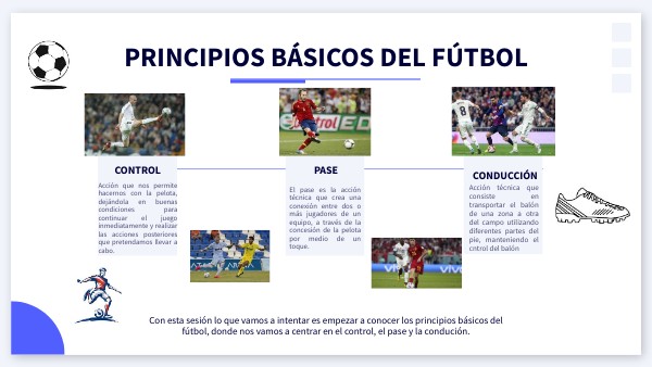 Con esta sesión lo que vamos a intentar es empezar a conocer los principios básicos del fútbol, donde nos vamos a centrar en el control, el pase y la condución.