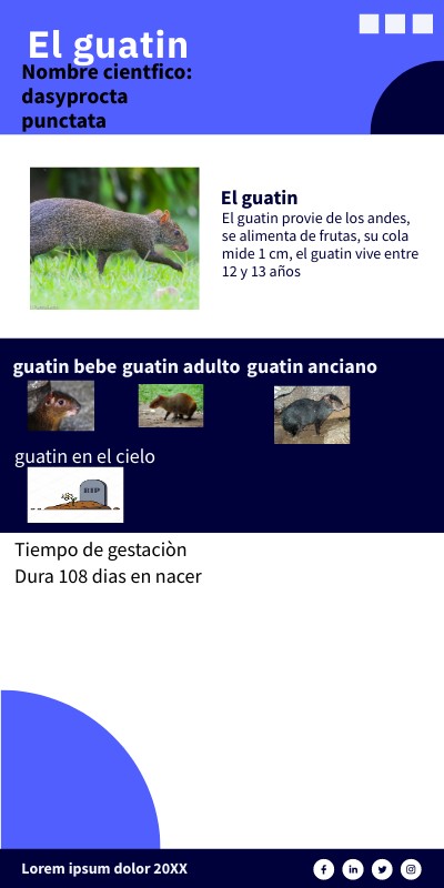 El guatin provie de los andes, se alimenta de frutas, su cola mide 1 cm, el guatin vive entre 12 y 13 años