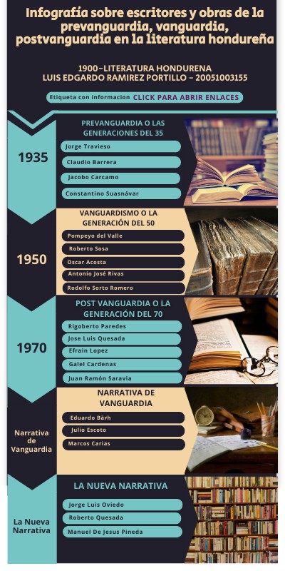 Infografía sobre escritores y obras de la prevanguardia, vanguardia, postvanguardia en la literatura hondureña