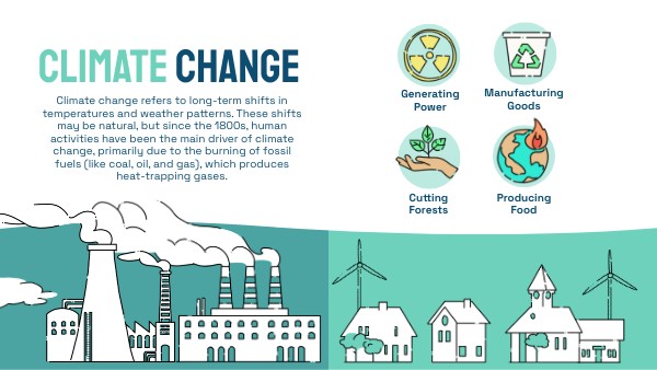 Climate change refers to long-term shifts in temperatures and weather patterns. These shifts may be natural, but since the 1800s, human activities have been the main driver of climate change, primarily due to the burning of fossil fuels (like coal, oil, and gas), which produces heat-trapping gases.