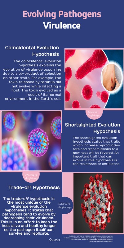The coincidental evolution hypothesis explains the evolution of virulence occurring due to a by-product of selection on other traits. For example, the toxin released by tetanus did not evolve while infecting a host. The toxin evolved as a result of its normal environment in the Earth’s soil.