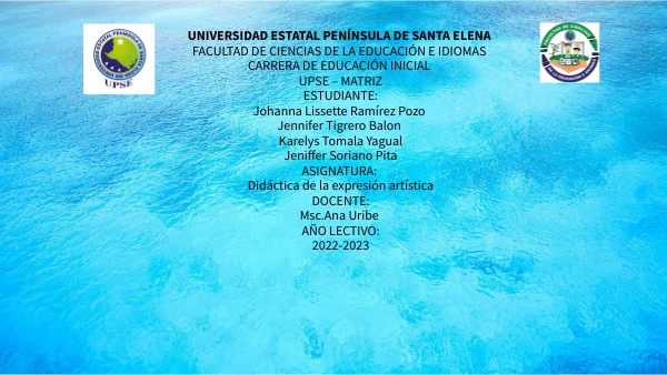 UNIVERSIDAD ESTATAL PENÍNSULA DE SANTA ELENA FACULTAD DE CIENCIAS DE LA EDUCACIÓN E IDIOMAS CARRERA DE EDUCACIÓN INICIAL UPSE – MATRIZ ESTUDIANTE: Johanna Lissette Ramírez Pozo Jennifer Tigrero Balon Karelys Tomala Yagual Jeniffer Soriano Pita ASIGNATURA: Didáctica de la expresión artística DOCENTE: Msc.Ana Uribe AÑO LECTIVO: 2022-2023