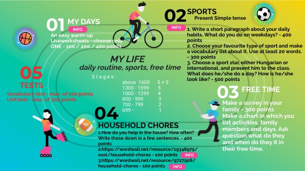 Present Simple tense1. Write a short paragraph about your daily habits. What do you do on weekdays? - 400 points 2. Choose your favourite type of sport and make a vocabulary list about it. Use at least 20 words. - 300 points 3. Choose a sport star, either Hungarian or international, and present him to the class. What does he/she do a day? How is he/she look like? - 500 points