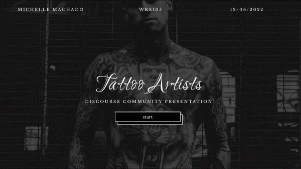 Identity is defined as the way a person displays themselves in a certain social setting or environment, maybe having a distinct national or cultural identity. When you have your own identity, you feel compelled to contribute or pick up knowledge from others. You must participate in new communities in order to accomplish this. A discourse community acts as a group in which one can belong to, sometimes being more than one at a time. The tattoo artist industry is no different in being a group that does exactly that. Tattooing is something that people are passionate about and love to share with each other, all having a common love for art. I I chose tattoo artists as my subject because I've always enjoyed tattoos and how imaginative and devoted tattoo artists can be to their craft. Through much research I was able to understand that tattoo artists have the intention of producing a work that the tattoo recipient could appreciate, as well as something priceless that people might admire. What shapes this discourse community to be so distinct from other communities is that they are literally altering one's identity, transferring permanent ink onto the receiver's skin. We see members indulging themselves in permanence to express themselves in the community, alongside normal discourse community attributes like specific lexis and genres.
