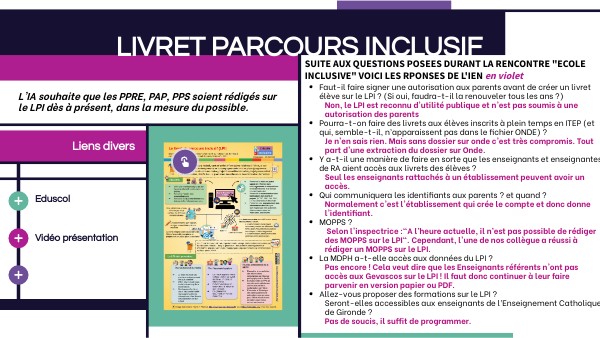 SUITE AUX QUESTIONS POSEES DURANT LA RENCONTRE "ECOLE INCLUSIVE" VOICI LES RPONSES DE L'IEN en violet