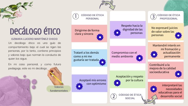Un decálogo ético es una guía de comportamiento bajo el cual se rigen las personas, por lo tanto, contiene principios y valores bajo que norman la conducta de quien los sigue. En mi caso personal, y como futura pedagoga, este es mi decálogo.