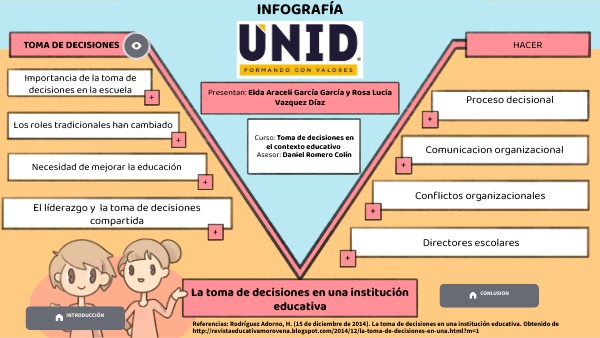Referencias: Rodríguez Adorno, H. (15 de diciembre de 2014). La toma de decisiones en una institución educativa. Obtenido de http://revistaeducativamorovena.blogspot.com/2014/12/la-toma-de-decisiones-en-una.html?m=1