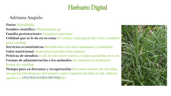 Nombre cientifico : Pennisetum sp. Familia perteneciente: Gramínea perenne Utilidad que se le da en su zona: Se utiliza como pasto de corte, también para ensilaje Servicios ecosistémicos: Benefician a los seres humanos y animales Valor nutricional: Aumenta la producción animal Práticas de siembra: es de 50 cm enter surcos, 2 cañas paralelas en 3 cm Formas de administración a los animales: Se suministra mediante forma de ensilaje Tiempo para su descanso y recuperación: Descanso menos de 120 días, recuperación despues del primer corte requiere 90 días el sgt, rebrote aparece a los 5 días desarrollo rápido.