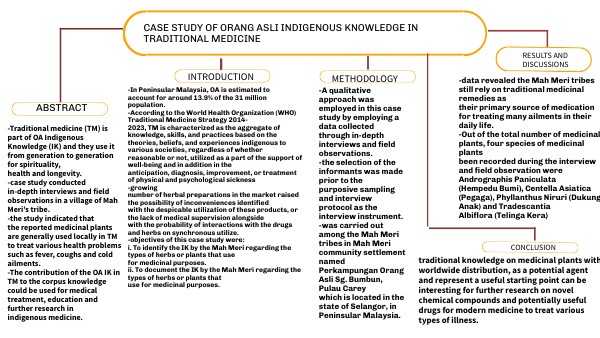 -Traditional medicine (TM) is part of OA Indigenous Knowledge (IK) and they use it from generation to generation for spirituality,health and longevity. -case study conducted in-depth interviews and field observations in a village of Mah Meri’s tribe. -the study indicated that the reported medicinal plants are generally used locally in TM to treat various health problems such as fever, coughs and cold ailments. -The contribution of the OA IK in TM to the corpus knowledge could be used for medical treatment, education and further research in indigenous medicine.