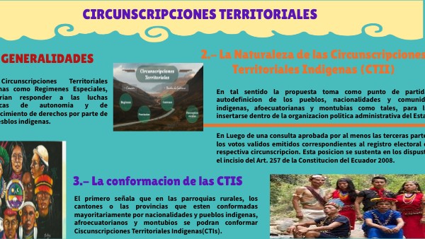 El primero señala que en las parroquias rurales, los cantones o las provincias que esten conformadas mayoritariamente por nacionalidades y pueblos indigenas, afroecuatorianos y montubios se podran conformar Ciscunscripciones Territoriales Indigenas(CTIs).