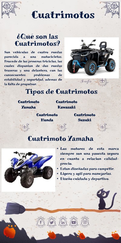 Son vehiculos de cuatro ruedas parecida a una motocicletas. Procede de los prmeros triciclos, los cuales disponian de dos ruedas traseras y una delantera, con los consecuentes problemas de estabilidad y seguridad, ademas de la falta de propulsor.