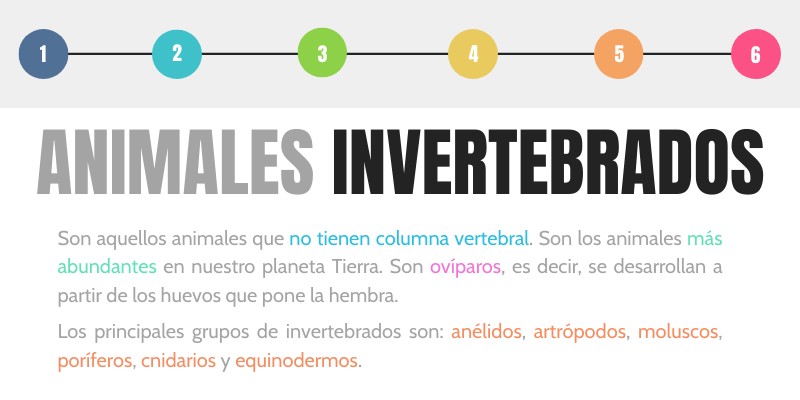 Son aquellos animales que no tienen columna vertebral. Son los animales más abundantes en nuestro planeta Tierra. Son ovíparos, es decir, se desarrollan a partir de los huevos que pone la hembra.
