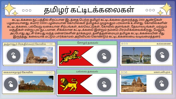 "தமிழ்நாட்டின் கட்டிடக்கலை." Theanamikapandey.com, theanamikapandey.com/architecture-of-tamil-nadu/. 10 ஏப். 2023 இல் அணுகப்பட்டது. அருள்மிகு நெல்லையப்பர் அருள்தரும் காந்திமதி அம்மன் கோவில் திருநெல்வேலி நகரம் | திருநெல்வேலி மாவட்டம், தமிழ்நாடு அரசு | இந்தியா. tirunelveli.nic.in/arulmigu-nellaiyappar-arultharum-gandhimathi-amman-temple-tirunelveli-town/. 10 ஏப். 2023 இல் அணுகப்பட்டது. "பகவதி அம்மன் கோவில், கன்னியாகுமரி: எப்படி அடைவது, சிறந்த நேரம் & குறிப்புகள்." Www.thrillophilia.com, www.thrillophilia.com/attractions/bhagavathy-amman-temple. அணுகப்பட்டது 16 ஏப். 2023. “பிரகதீஸ்வரர் கோயில்|| தஞ்சாவூர் சுற்றுலா” Www.thanjavurtourism.com, www.thanjavurtourism.com/big-temple-thanjavur.html. 10 ஏப். 2023 இல் அணுகப்பட்டது. மையம், யுனெஸ்கோ உலக பாரம்பரியம். "மகாபலிபுரத்தில் உள்ள நினைவுச்சின்னங்களின் குழு." யுனெஸ்கோ உலக பாரம்பரிய மையம், whc.unesco.org/en/list/249/#:~:text=மகாபலிபுரம்%20(அல்லது%20மாமல்லபுரம்)%2C%20இடம். 10 ஏப். 2023 இல் அணுகப்பட்டது. “சேரா வம்சம் | இந்தியா | பிரிட்டானிக்கா.” Www.britannica.com, www.britannica.com/topic/Cera-dynasty. அணுகப்பட்டது 16 ஏப். 2023. “சோழ வம்சம் | இந்தியா.” என்சைக்ளோபீடியா பிரிட்டானிக்கா, www.britannica.com/topic/Chola-dynasty. அணுகப்பட்டது 15 ஏப். 2023. "காஞ்சிபுரத்தில் உள்ள கைலாசநாதர் கோவில், கைலாசநாதர் கோவில் வரலாறு." Www.kancheepuramonline.in, www.kancheepuramonline.in/city-guide/kailasanathar-temple. 10 ஏப். 2023 இல் அணுகப்பட்டது. “கல்லனை அணை || தஞ்சாவூர் சுற்றுலா” Www.thanjavurtourism.com, www.thanjavurtourism.com/kallanai-dam.html. 10 ஏப். 2023 இல் அணுகப்பட்டது. குமார், சமனாதா. "10 கட்டிடங்களில் தென்னிந்தியாவின் கட்டிடக்கலை பாரம்பரியம் - எதிர்காலத்தை மறுபரிசீலனை செய்தல்." RTF | எதிர்காலத்தை மறுபரிசீலனை செய்தல், 8 ஜனவரி 2020, www.re-thinkingthefuture.com/2020/01/08/a481-architectural-heritage-of-south-india-in-10-buildings/. 10 ஏப். 2023 இல் அணுகப்பட்டது. "மதுரை மீனாட்சி அம்மன் கோவில் - வரலாறு, கட்டிடக்கலை, நேரங்கள்." Culturalindia.net, 2019, www.culturalindia.net/indian-temples/meenakshi-temple.html. 10 ஏப். 2023 இல் அணுகப்பட்டது. “பல்லவ வம்சம் | இந்திய வரலாறு.” என்சைக்ளோபீடியா பிரிட்டானிக்கா, www.britannica.com/topic/Pallava-dynasty. அணுகப்பட்டது 15 ஏப். 2023. “பாண்டிய வம்சம் | இந்திய வம்சம் | பிரிட்டானிக்கா.” Www.britannica.com, www.britannica.com/topic/Pandya-dynasty. அணுகப்பட்டது 15 ஏப். 2023. "தமிழ் கட்டிடக்கலை - தமிழர் பாரம்பரியம்." தமிழ் பாரம்பரியம், 11 மே 2021, telibrary.com/en/%E0%AE%A4%E0%AE%AE%E0%AE%BF%E0%AE%B4%E0%AE%B0%E0%AF%8D- %E0%AE%95%E0%AE%9F%E0%AF%8D%E0%AE%9F%E0%AE%BF%E0%AE%9F%E0%AE%95%E0%AF%8D%E0 %AE%95%E0%AE%B2%E0%AF%88/. 10 ஏப். 2023 இல் அணுகப்பட்டது. "திருவஞ்சிக்குளம்." Www.divinetraveller.net, www.divinetraveller.net/srivanchikulam.html. அணுகப்பட்டது 16 ஏப். 2023. “திருவஞ்சிக்குளம் மகாதேவர் கோயில், கோட்டப்புரம் | எர்ணாகுளம், முசிரிஸ் பாரம்பரியப் பகுதியில் உள்ள மதத் தளங்கள். Www.muzirisheritage.org, www.muzirisheritage.org/thiruvanchikulam-mahadeva-temple.php. அணுகப்பட்டது 15 ஏப். 2023.