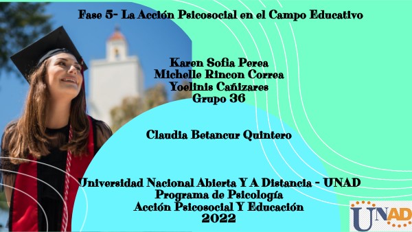 Fase 5- La Acción Psicosocial en el Campo Educativo Karen Sofia Perea Michelle Rincon Correa Yoelinis Cañizares Grupo 36 Claudia Betancur Quintero Universidad Nacional Abierta Y A Distancia - UNAD Programa de Psicología Acción Psicosocial Y Educación 2022