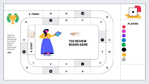 Choose a token, roll the dice and try to reach the goal before anyone else. Good luck!