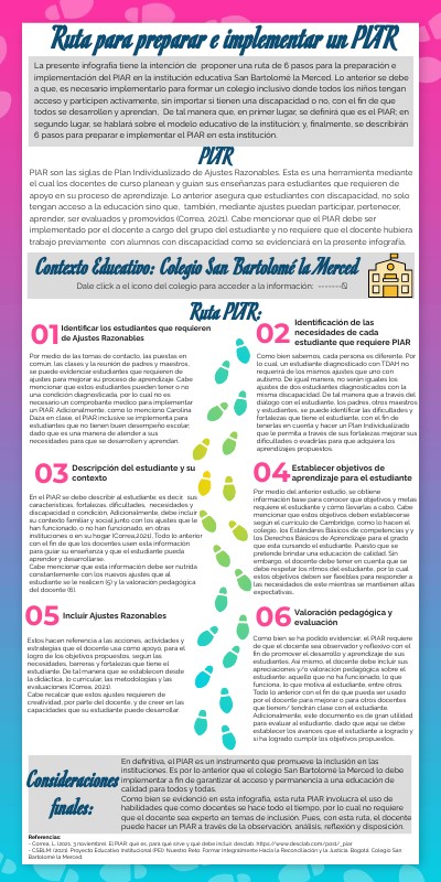 La presente infografía tiene la intención de proponer una ruta de 6 pasos para la preparación e implementación del PIAR en la institución educativa San Bartolomé la Merced. Lo anterior se debe a que, es necesario implementarlo para formar un colegio inclusivo donde todos los niños tengan acceso y participen activamente, sin importar si tienen una discapacidad o no, con el fin de que todos se desarrollen y aprendan, De tal manera que, en primer lugar, se definirá que es el PIAR; en segundo lugar, se hablará sobre el modelo educativo de la institución; y, finalmente, se describirán 6 pasos para preparar e implementar el PIAR en esta institución.