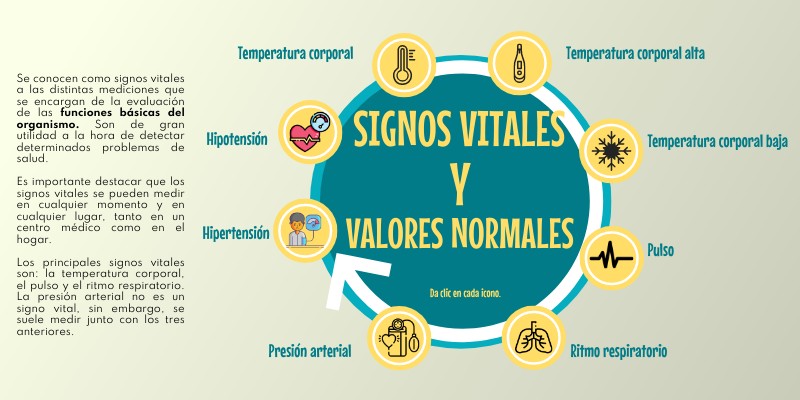 Se conocen como signos vitales a las distintas mediciones que se encargan de la evaluación de las funciones básicas del organismo. Son de gran utilidad a la hora de detectar determinados problemas de salud. Es importante destacar que los signos vitales se pueden medir en cualquier momento y en cualquier lugar, tanto en un centro médico como en el hogar. Los principales signos vitales son: la temperatura corporal, el pulso y el ritmo respiratorio. La presión arterial no es un signo vital, sin embargo, se suele medir junto con los tres anteriores.