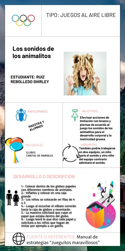 1.- Colocar dentro de los globos papeles con diferentes nombres de animales. 2.- Inflarlos y colocar en una caja grande 3.- Los niños se colocarán en filas de 4 o 5 4.- Luego al escuchar el silbato correrán hacia la caja de globos y reventarán 5.- La maestra solicitará que cojan el papel que estaba dentro del globo. 6.- Luego leerá lo que dice cada papel y solicitara a los niños que hagan de imitar por ejemplo a un gatito.