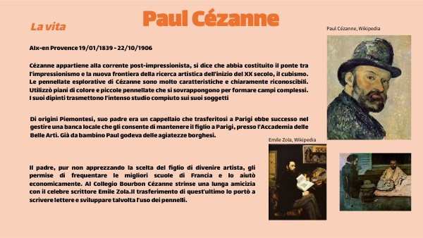 Il padre, pur non apprezzando la scelta del figlio di divenire artista, gli permise di frequentare le migliori scuole di Francia e lo aiutò economicamente. Al Collegio Bourbon Cézanne strinse una lunga amicizia con il celebre scrittore Emile Zola.Il trasferimento di quest’ultimo lo portò a scrivere lettere e sviluppare talvolta l’uso dei pennelli.