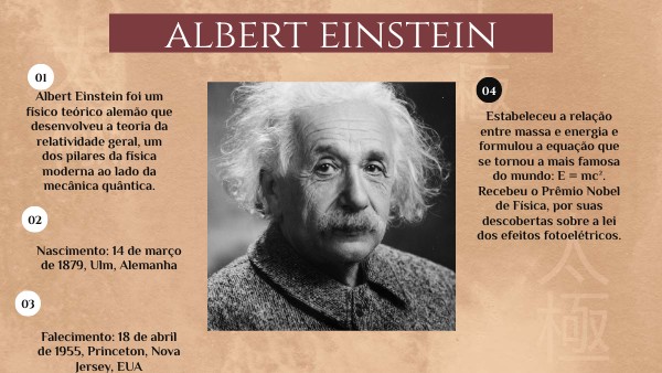 Estabeleceu a relação entre massa e energia e formulou a equação que se tornou a mais famosa do mundo: E = mc². Recebeu o Prêmio Nobel de Física, por suas descobertas sobre a lei dos efeitos fotoelétricos.