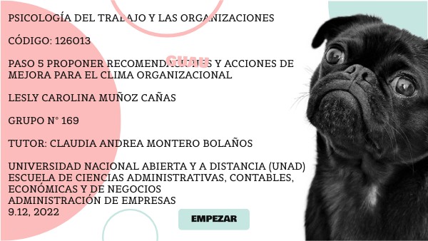 Psicología del Trabajo y las OrganizacionesCódigo: 126013 Paso 5 Proponer recomendaciones y acciones de mejora para el clima organizacional Lesly Carolina Muñoz Cañas Grupo N° 169 Tutor: Claudia Andrea Montero Bolaños Universidad Nacional Abierta y a Distancia (UNAD) Escuela de Ciencias Administrativas, Contables, Económicas Y de Negocios Administración de Empresas 9.12, 2022