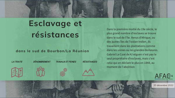 Dans la première moitié du 19e siècle, le plus grand nombre d'esclaves se trouve dans le sud de l'île. Venus d'Afrique, ou des autres îles de l'océan Indien, ils travaillent dans les plantations comme dans les usines ou les grandes demeures. Gabriel Le Coat de K/véguen n'est pas le seul propriétaire d'esclaves, mais c'est celui qui en déclare le plus en 1848, au moment de l'abolition