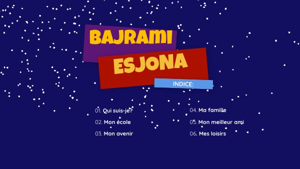 Bonjour à tous, je m'appelle Bajrami Esjona, j'ai quinze ans, j'habite à Chiavari. Je suis une fille très ensoleillée, gentille et agréable. Je suis assez grand, je suis mince, mes yeux et mes cheveux sont bruns. Je suis assez grand, je suis mince, mes yeux et mes cheveux sont bruns.