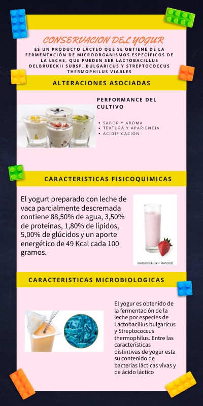El yogur es obtenido de la fermentación de la leche por especies de Lactobacillus bulgaricus y Streptococcus thermophilus. Entre las características distintivas de yogur esta su contenido de bacterias lácticas vivas y de ácido láctico