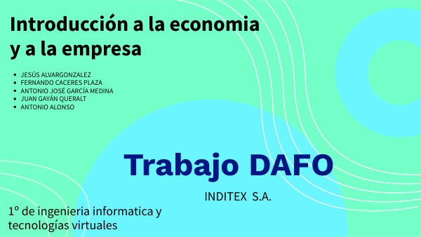 JESÚS ALVARGONZALEZ ( Genially, Análisis externo e interno, Conclusiones, Correcciones en su parte, DAFO, Revisión, Enlaces.)FERNANDO CACERES PLAZA ( Genially, Análisis interno, Conclusiones, Correcciones en su parte, Revisión, Enlaces.) ANTONIO JOSÉ GARCÍA MEDINA ( Introducción e índice, Descripción, Conclusiones, Correcciones en su parte, Revisión, Enlaces.) JUAN GAYÁN QUERALT ( Introducción e índice, Descripción , Conclusiones, Correcciones en su parte, Revisión, Enlaces.) ANTONIO ALONSO ( Genially, Introducción e índice, Conclusiones, Correcciones en su parte, Revisión, Enlaces.)