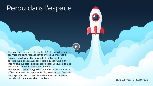 Houston ton oncle est astronaute, il s'est perdu dans une de ses missions dans l'espace et t'as envoyé un message de secours dans lequel il te demande de voler une fusée en secret pour aller le sauver car il est bloqué sur une planète inconnue, pour cela tu dois réussir à voler une fusée, la faire décoller et trouver la bonne destination. Tu disposes d'un prototype de combinaison qui vient juste d'être inventé et qui te permettra de te rendre sur n'importe quelle planète. Il t'a laissé des indices que seul toi pourra décoder afin de mener à bien ta mission.
