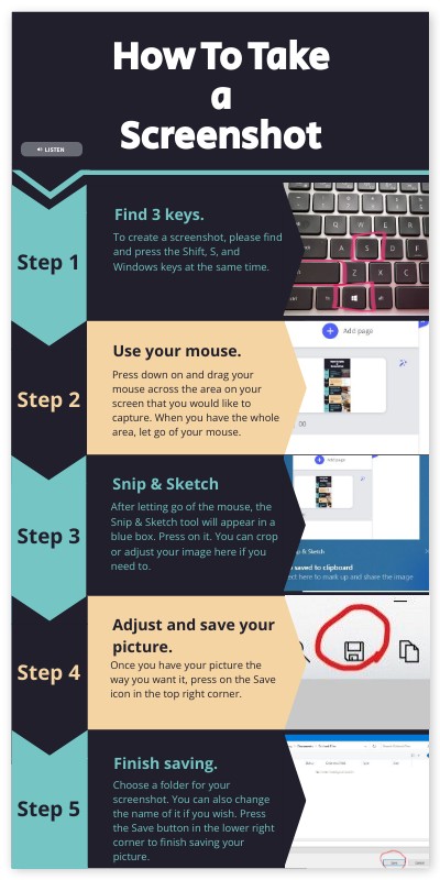 To create a screenshot, please find and press the Shift, S, and Windows keys at the same time.