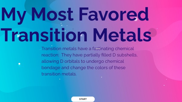 Transition metals have a fastinating chemical reaction: They have partially filled D subshells, allowing D orbitals to undergo chemical bondage and change the colors of these transition metals.