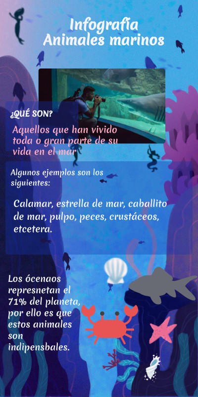 Calamar, estrella de mar, caballito de mar, pulpo, peces, crustáceos, etcetera.