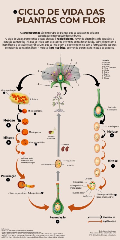 Referências: - https://pt.wikipedia.org/wiki/Gamet%C3%B3fito - https://www.coladaweb.com/biologia/botanica/angiospermas - https://djalmasantos.wordpress.com/2010/11/28/polinizacao-e-fecundacao-nas-espermatofitas/ - Ferreira, Ana L.; Bação, Fernando A.; Jacinto, Maria J.; Silva, Paula A.; Duarte, Maria A.; Lobo, Sandra C. ; BIOGEO 11 - Vol.1 - Biologia e Geologia - 11o ano; 1a Edição; Editora Texto; Lisboa; 2022; p. 123 e 135.