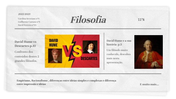 David Hume foi filósofo, historiador, ensaísta e diplomata escocês, um dos mais importantesfilósofos modernos do Iluminismo.Seus pensamentos foram revolucionários, sendo assim acusado de heresia pela igrejacatólica por culpa das ideias associadas a ateísmo e ceticismo.Obras conhecidas: