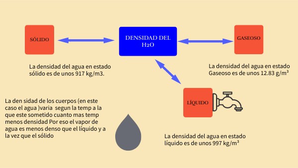 La den sidad de los cuerpos (en este caso el agua )varia segun la temp a la que este sometido cuanto mas temp menos densidad Por eso el vapor de agua es menos denso que el líquido y a la vez que el sólido