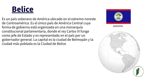Es un país soberano de América ubicado en el extremo noreste de Centroamérica. Es el único país de América Central cuya forma de gobierno está organizada en una monarquía constitucional parlamentaria, donde el rey Carlos III funge como jefe de Estado y es representado en el país por un gobernador general. La capital es la ciudad de Belmopán y la ciudad más poblada es la Ciudad de Belice