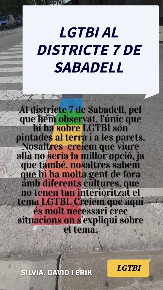 Al districte 7 de Sabadell, pel que hem observat, l'únic que hi ha sobre LGTBI són pintades al terra i a les parets.Nosaltres creiem que viure allà no seria la millor opció, ja que també, nosaltres sabem que hi ha molta gent de fora amb diferents cultures, que no tenen tan interioritzat el tema LGTBI. Creiem que aquí és molt necessari crec situacions on s'expliqui sobre el tema.