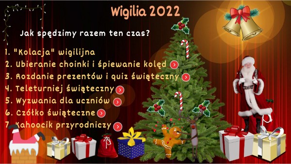 1. "Kolacja" wigilijna 2. Ubieranie choinki i śpiewanie kolęd 3. Rozdanie prezentów i quiz świąteczny 4. Teleturniej świąteczny 5. Wyzwania dla uczniów 6. Czółko świąteczne 7. Kahoocik przyrodniczy