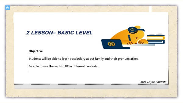 Objective: Students will be able to learn vocabulary about family and their pronunciation. Be able to use the verb to BE in different contexts. .