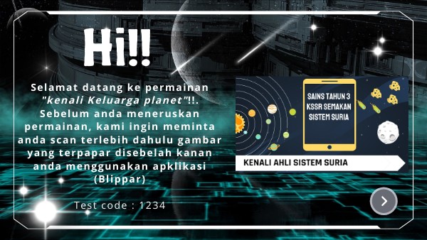 Selamat datang ke permainan "kenali Keluarga planet"!!. Sebelum anda meneruskan permainan, kami ingin meminta anda scan terlebih dahulu gambar yang terpapar disebelah kanan anda menggunakan apklikasi (Blippar) Test code : 1234