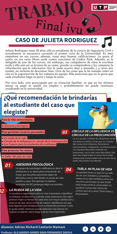 Julieta Rodriguez tiene 18 años, ella es estudiante de la carrera de Ingeniería Civil y actualmente se encuentra cursando el primer ciclo de la Universidad. Es muy empeñosa en sus cursos, además, tiene muy buenas calificaciones. Le gusta el canto, en sus ratos libres suele cantar canciones de Linkin Park. Además, es la delegada de uno de los cursos, sin embargo, sus compañeros de clase le escriben tarde y ella aún así se levanta de su cama, prende su computadora y les comparte la información que le solicitaron. Eso le suele ocurrir muy a menudo, y a veces por ayudar, no termina de descansar bien. Otra de las cosas que le ha tomado como un reto es la organización de los trabajos en equipo. Ella menciona que no le gusta que cada estudiante haga su parte y luego la unan. Por otro lado, está preocupada por su situación familiar, ya que en los últimos meses su papá se quedó sin empleo y probablemente no pueda continuar estudiando en la universidad.